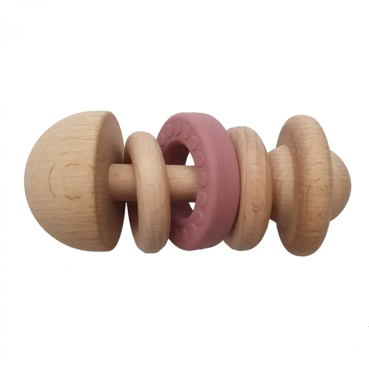 En barnskallra i trä och silikon som är lätt för barnet att hålla i och spännande att utforska. Den är utformad för små händer och uppmuntrar till lek och rörelse.