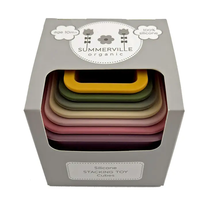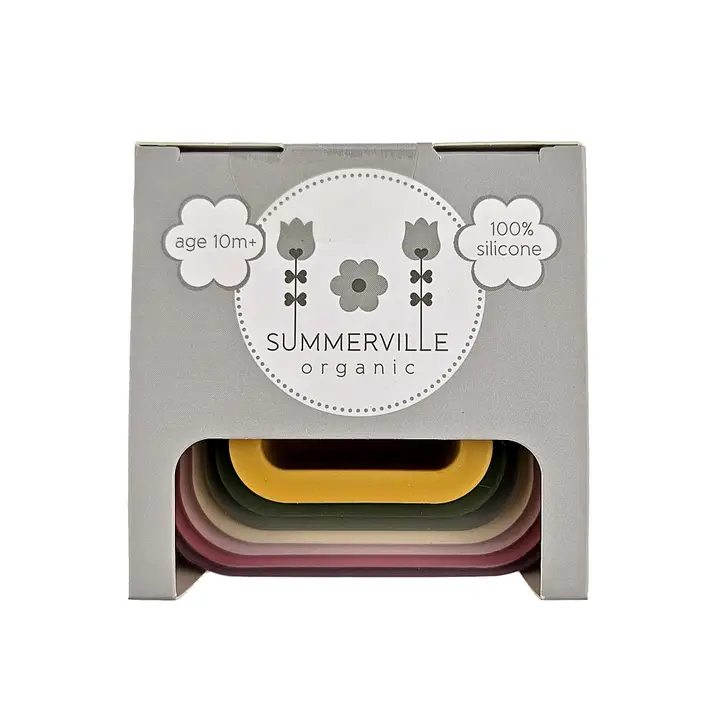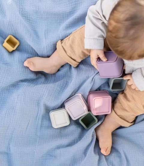 En stapelleksak med fyrkantiga koppar i silikon som stimulerar barnets kreativa lek. Kopparna kan sättas i varandra eller staplas för att bygga ett torn.