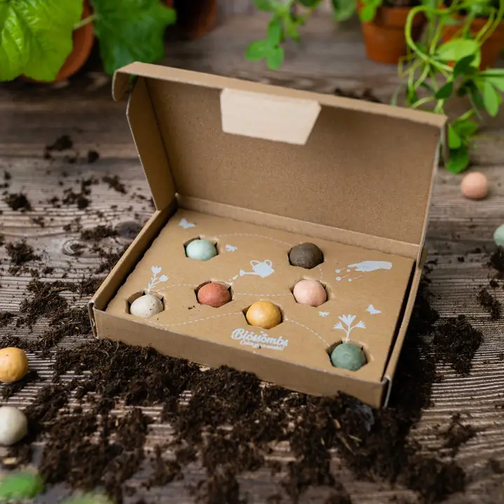 Presentlådan innehåller 7 färgglada fröbomber fyllda med ekologiska ängsblommor och naturliga ingredienser.