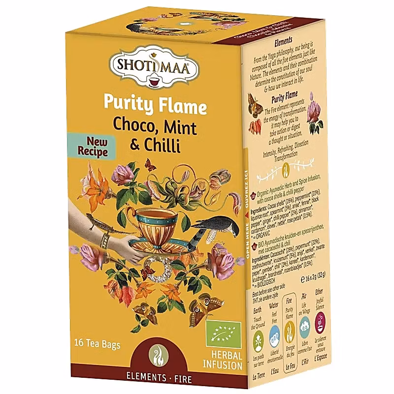 Ett 100% ekologiskt örtte med söt kakao, mynta och chili som huvudingredienser. En värmande, energigivande och kryddig blandning som balanserar eldelementet – elementet som står för kraft, motivation, passion och livsenergi.