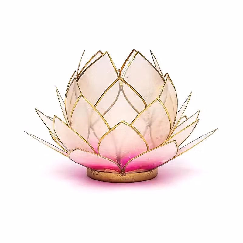 Dekorativt lotusljus i rosa capizskal ((naturliga havsmusselskal) med guldfärgade detaljer. Lotusblomman symboliserar övergången från mörker till ljus och från okunskap till kunskap, och förknippas ofta med kroppens sju energicentra – chakran. Perfekt som stämningsfull dekoration eller för meditation och avkoppling.