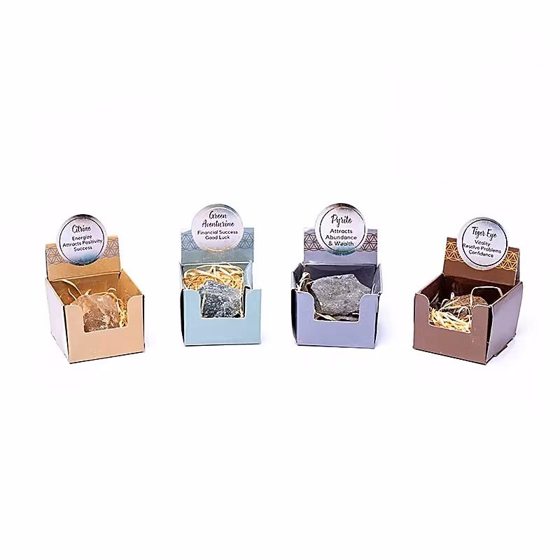 Små boxar med råa halvädelstenar i fyra olika varianter, utvalda för att symbolisera välstånd, energi och positivitet. Varje box innehåller en naturlig sten med unika färger och former, vilket gör varje set speciellt. Perfekta som present, samlarstenar eller dekorativa naturstenar i hemmet.