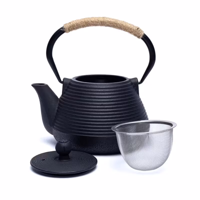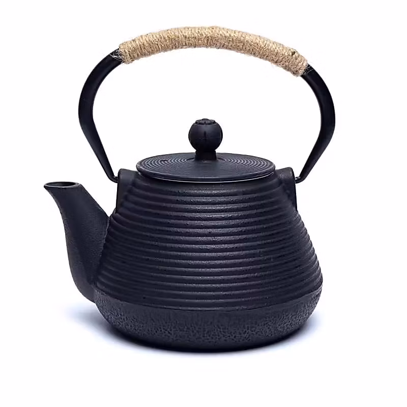 Japansk tekanna i gjutjärn med emaljerad insida som bevarar teets rena smak. Den robusta konstruktionen håller värmen länge och fördelar den jämnt för bästa smakextraktion. Handtaget är lindat med sisalrep för bättre grepp och värmeskydd.