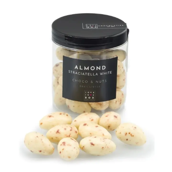 Krispiga rostade mandlar täckta med krämig vit choklad och bitar av mörk choklad med vaniljsmak. Kombinationen av rostade mandlar och len choklad ger en rik och balanserad smakupplevelse inspirerad av klassisk stracciatella.
