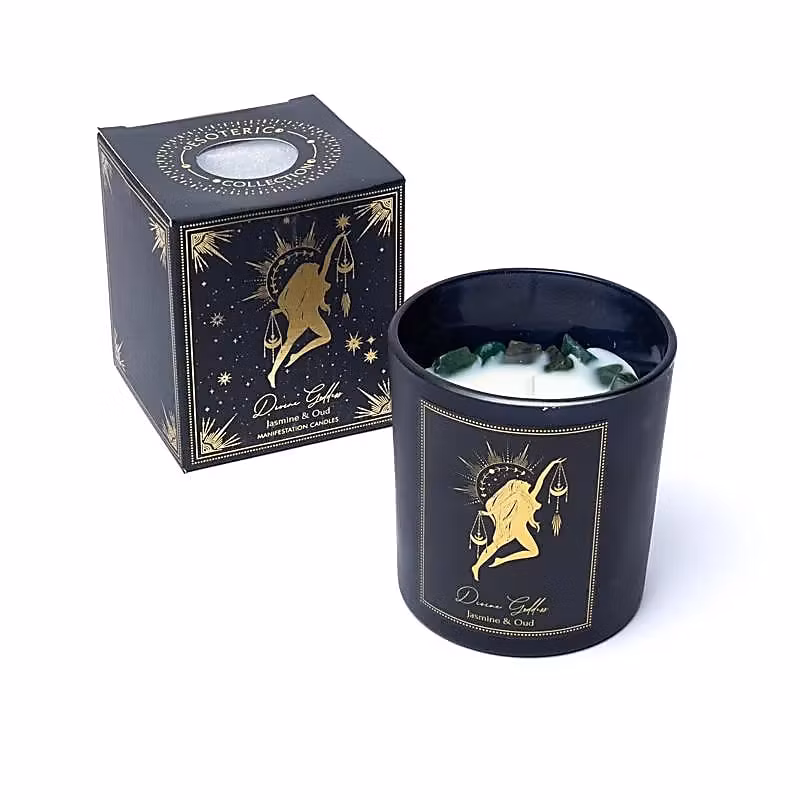Ett skimrande manifestationsljus i glas med lock, handgjutet av sojavax och palmkärnvax. Ljuset är doftsatt med eteriska oljor och berikat med äkta Xinji-jade. När ljuset brinner sjunker kristallerna långsamt ner i vaxet – och när ljuset är slut kan du spara stenarna som ett personligt energismycke.